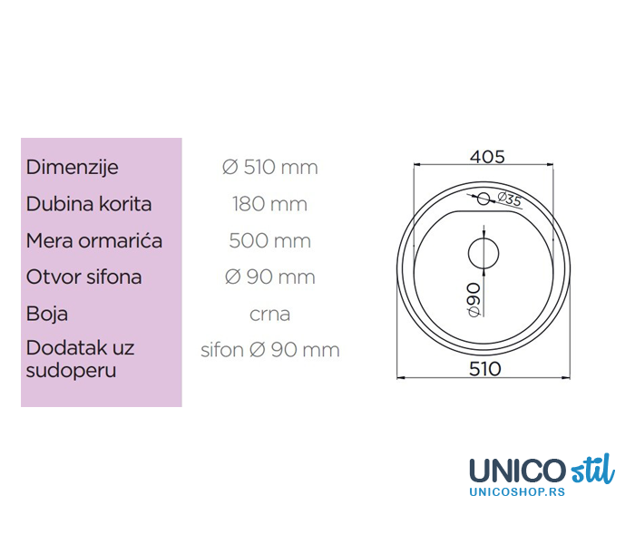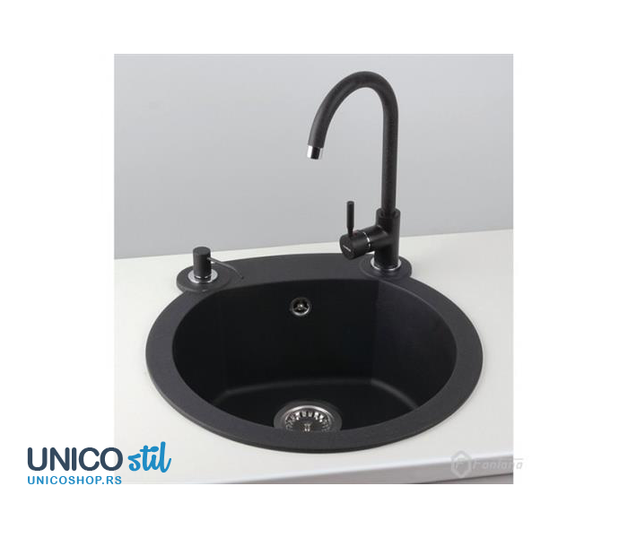 Proizvođač METALAC Sudopera X Venera Fi 510 crna Dimenzije: Ø510 mm Dubina korita: 180 mm Mera ormarica: 500 mm Otvor sifona: Ø90 mm Dodatak uz sudoperu: sifon Ø90 mm Sudopere X Granit izrađene su od kompozitnog materijala, čiji je glavni sastojak kvarc-najtvrđi element granita, zbog čega su ove sudopere poznate kao ` granitne sudopere`. Prirodni materijal kvarc, koji čini 80% sastava X granita u kontrolisanim uslovima meša se sa odgovarajućom smolom, najvišeg kvaliteta. Krajnji rezultat je materijal izuzetnog kvaliteta, čvrstoće i otpornosti, koji odaje utisak prirodnog kamena. Jednostavne za održavanje, izuzetna trajnost, izgled prirodnog kamena, otpornost na grebanje, izuzetna čvrstoća i otpornost na lomljenje, otpornost na temperature do 280 C, higijenska ispravnost i pogodnost za upotrebu hrane, otpornost na kiseline, boja sudopere ne bledi i otporna je na sunceve zrake, savršeno se uklapa u svaki enterijer. Zemlja porekla Srbija.